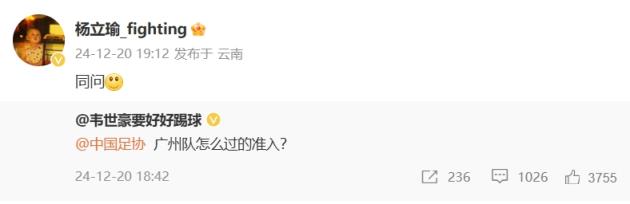 12月20日訊 韋世豪發(fā)聲質(zhì)疑后,楊立瑜轉(zhuǎn)發(fā)韋世豪微博質(zhì)疑足協(xié)準入。